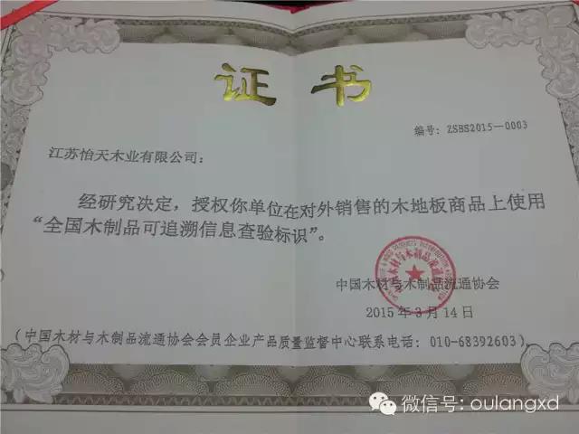賀:歐朗地板(江蘇怡天木業(yè))榮獲首批“全國木制品可追溯信息查驗標識”使用授權