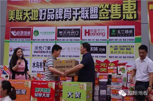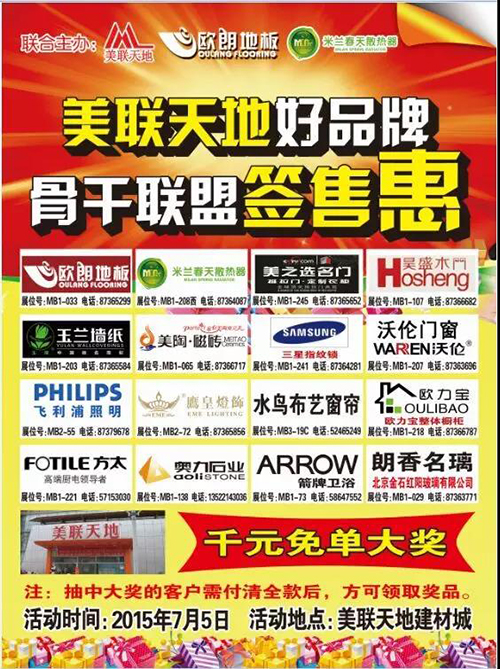 2015年5月17日下午1點30分,由歐朗地板和米蘭春天散熱器聯(lián)合主辦的第二屆美聯(lián)天地好品牌骨干聯(lián)盟簽售惠即將舉辦!此次活動由美聯(lián)天地16家好品牌參與,參加活動的16家品牌都將以超低的價格折扣和豐富多彩的禮品大獎回饋廣大業(yè)主朋友們,并公平公正公開的進(jìn)行抽獎活動,使大家高興而來滿意而歸。大獎多多好運多多!期待你的到來!
